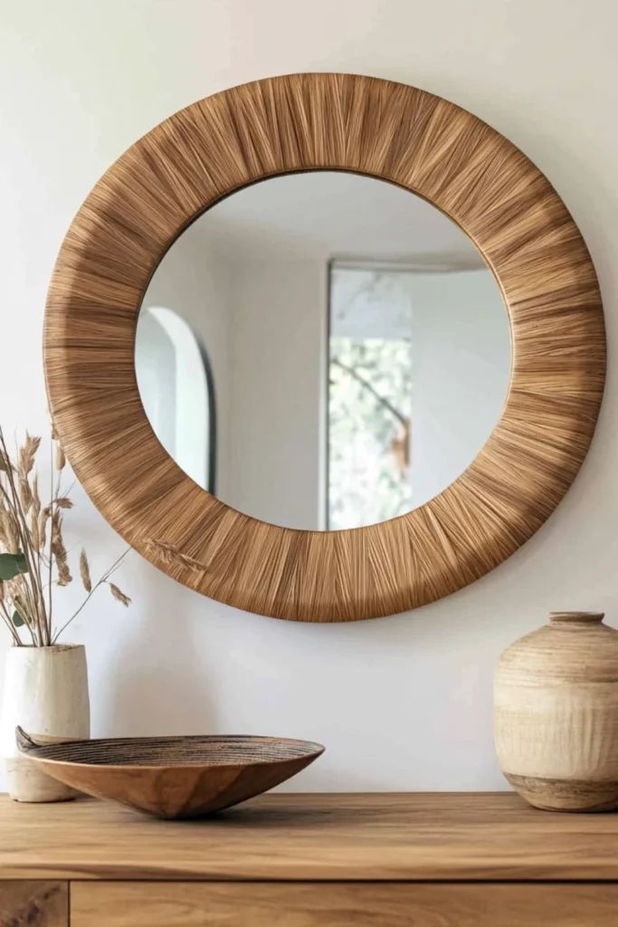 Espejo circular con acabado en fibras naturales, ideal para ambientes cálidos y decoración tipo boho.