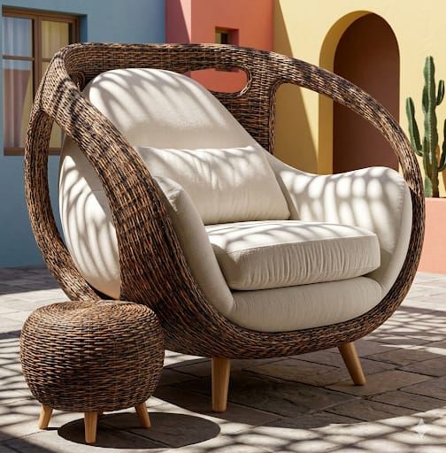 Sillón moderno de mimbre con diseño envolvente y cojines acolchonados, ideal para terrazas o interiores con estilo natural.